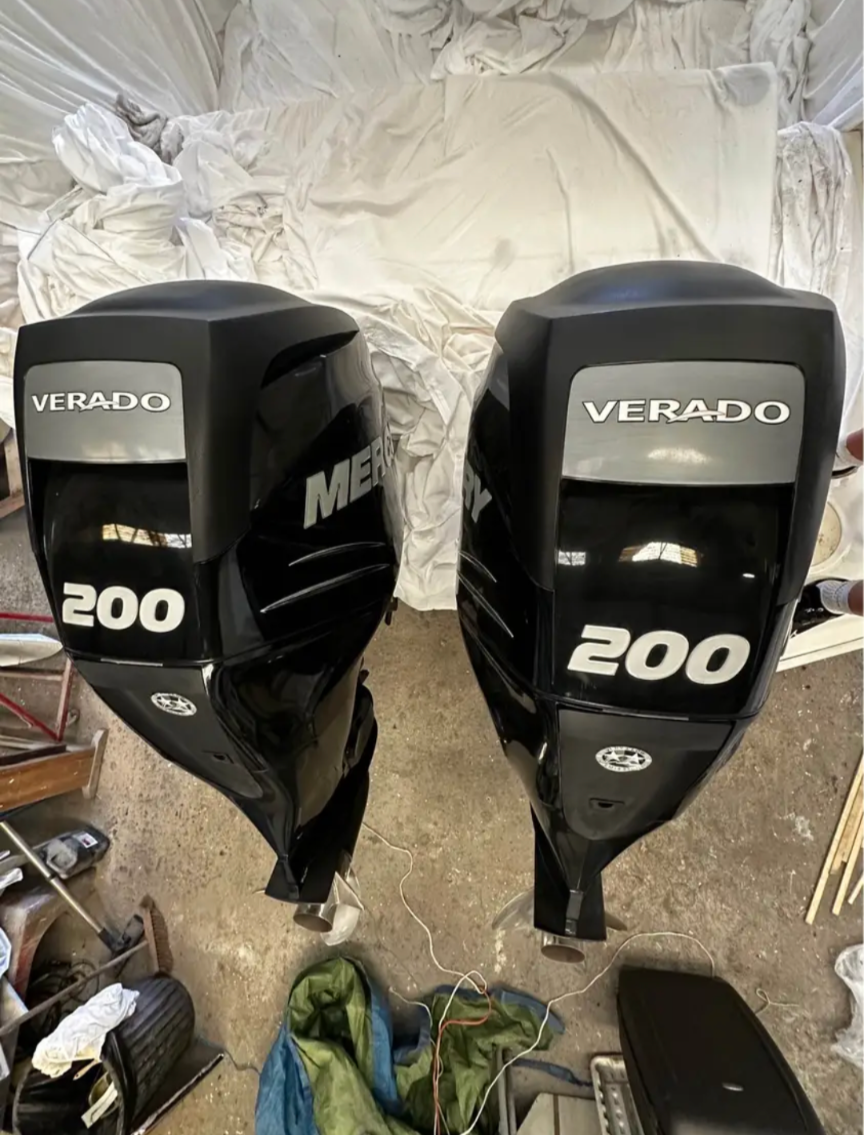 Zwei 200 PS Mercury Verado Außenbordmotoren aus dem Jahr 2017. Diese Motoren wurden alle 100 Stunden gewartet und weisen aktuell 2100 Stunden auf. Sie wurden nur leicht auf einem Trainingsboot genutzt und nie für Rennen oder intensive Einsätze verwendet.